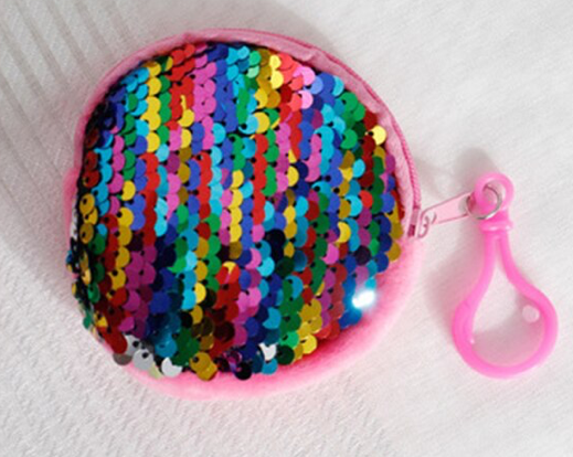Runde Geldbörse aus Plüsch in pink mit Regenbogenpailletten